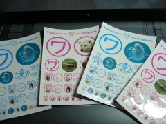 近所の大手家電店に行ったら、ケータイ売り場のソフトバンクのところに「タダ友の輪を広げよう」のシールがあって、いただいていちゃいました。ブルーとピンクの2種類がありますの。“お父さん”や“島根のおじさま”のシールがかわいいですの。